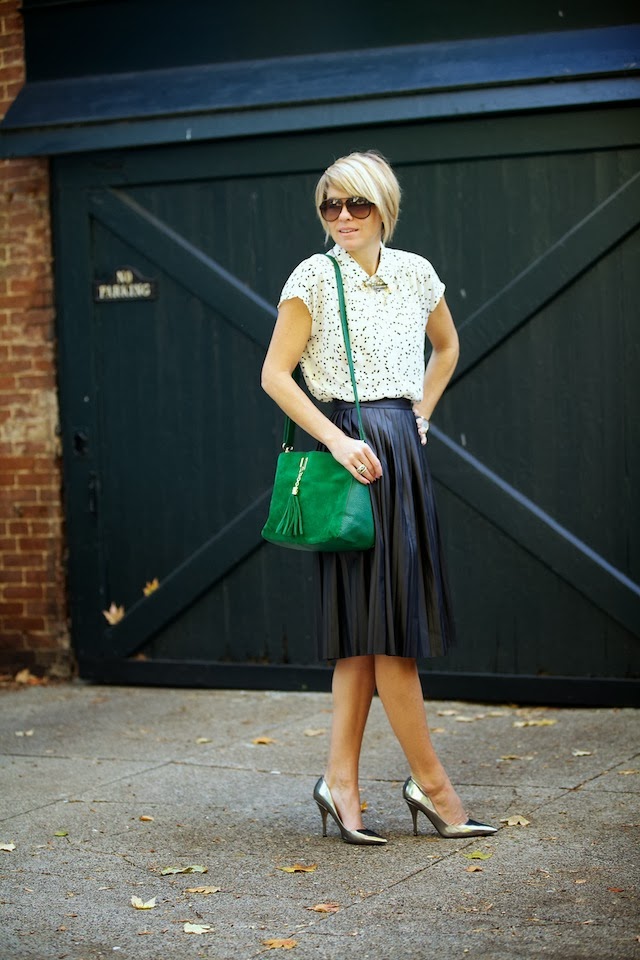 skirt (Asos 10% off), blouse (LOFT see Long Sleeved Dots HERE), bag (Galian c/o LOVE this EMERALD), heels (Kate Spade), necklace (Sheer Addiction c/o), watch (Cartier), shades (Gucci), ring (David Yurman, Anna Beck)