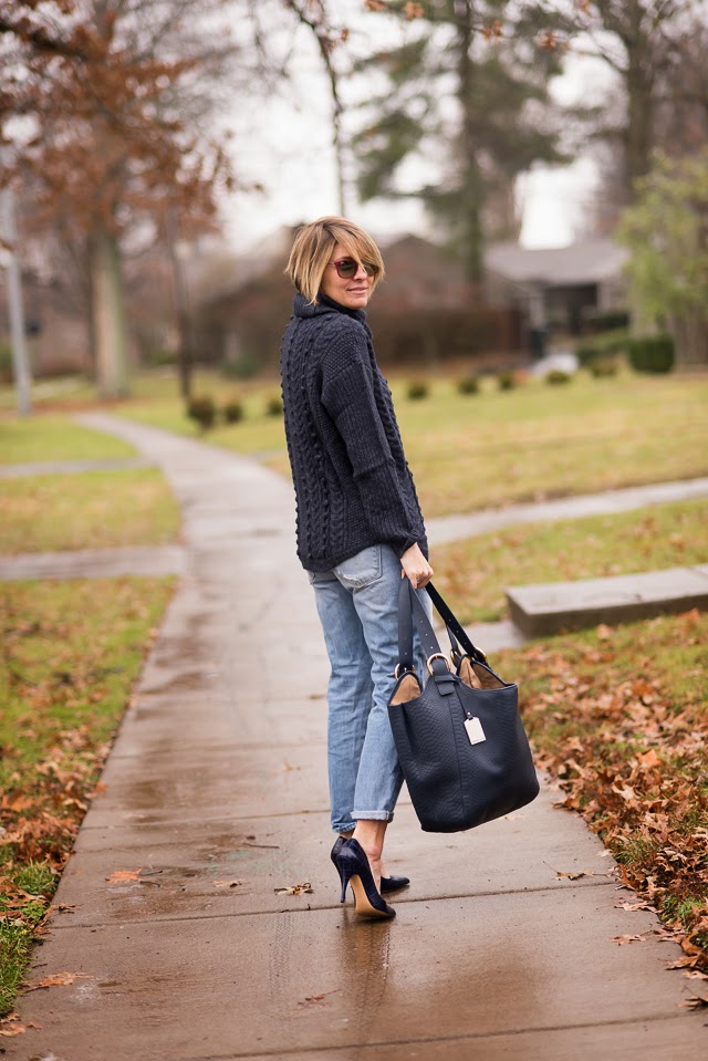 I could live in this look, except let's sub these Navy Croc Heels with my fave new Leo Ballets, and I'd literally wear this number everyday (which if you saw me last week, I pretty much did). There's something so effortless about slouchy pieces--little tip is make sure to roll the cuffs and show a little ankle--just a little hint of skin to ensure the look isn't sloppy. Essentially I'm just wearing a whole heap of navy in this look but the various textures (pom poms, croc, & python) add elements of interest to keep her from looking dull.